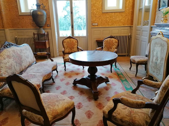 Dans la pièce de réception, avec ses trois canapés confortables, sa table à jeu et son salon Louis XV, vous passerez des soirées inoubliables sous les lustres à pampilles en cristal, qui se reflètent dans les deux grands miroirs de cheminée.